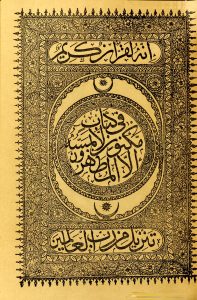 The caligraphy of the muṣḥaf is in a pleasing naskh script that is very readable eventhough it is quite compact of 20 lines per page and approximately 14 words per line and a total of 305 pages including the title page and two pages for the first two sūrāt. It has sūra header with the following information: name of sūra, Meccan or Medianan, and number of ayāt with the various opinion. The design of the header is very compact and allows for leftover words of the last aya that do not take a entire line of text to be strategically place in the decorative sūra dividers and this is utilized throughout the text. The bismalla[6] came in two styles one that is a full line width and another compact one.